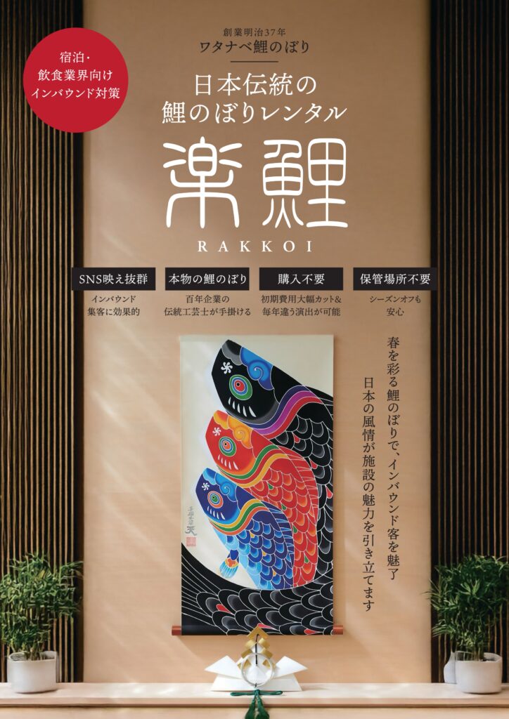 宿泊、飲食業界向けインバウンド対策として鯉のぼりレンタル「楽鯉(らっこい)」のサービスを開始しました。